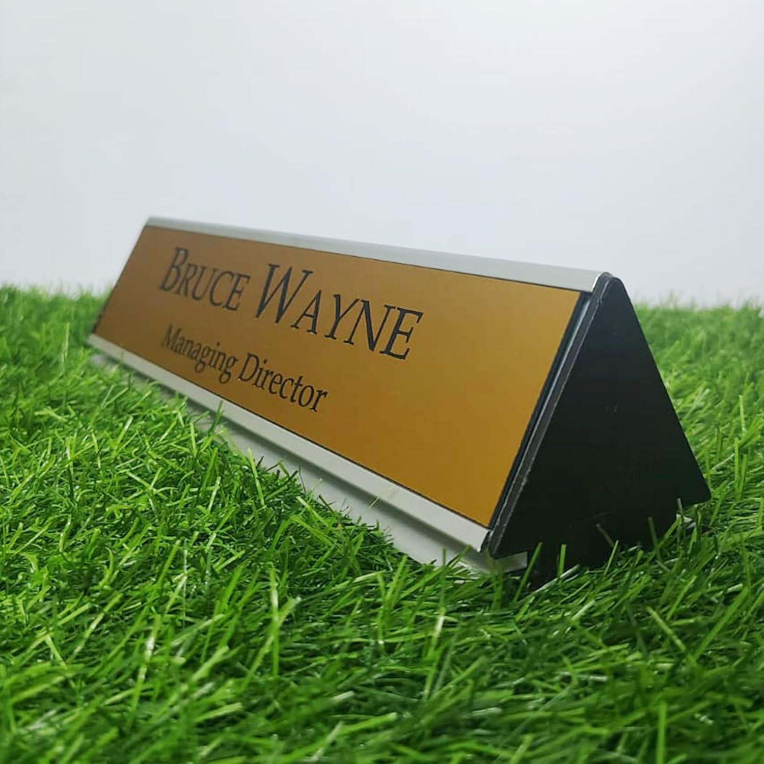 Gugan's Aluminum Desk Name Plate – Personalized Office Name Sign with Holder, Modern Desk Décor for Professionals, Boss, and Executives- Double Side (12 x 3 Inches) (Gold, Silver)