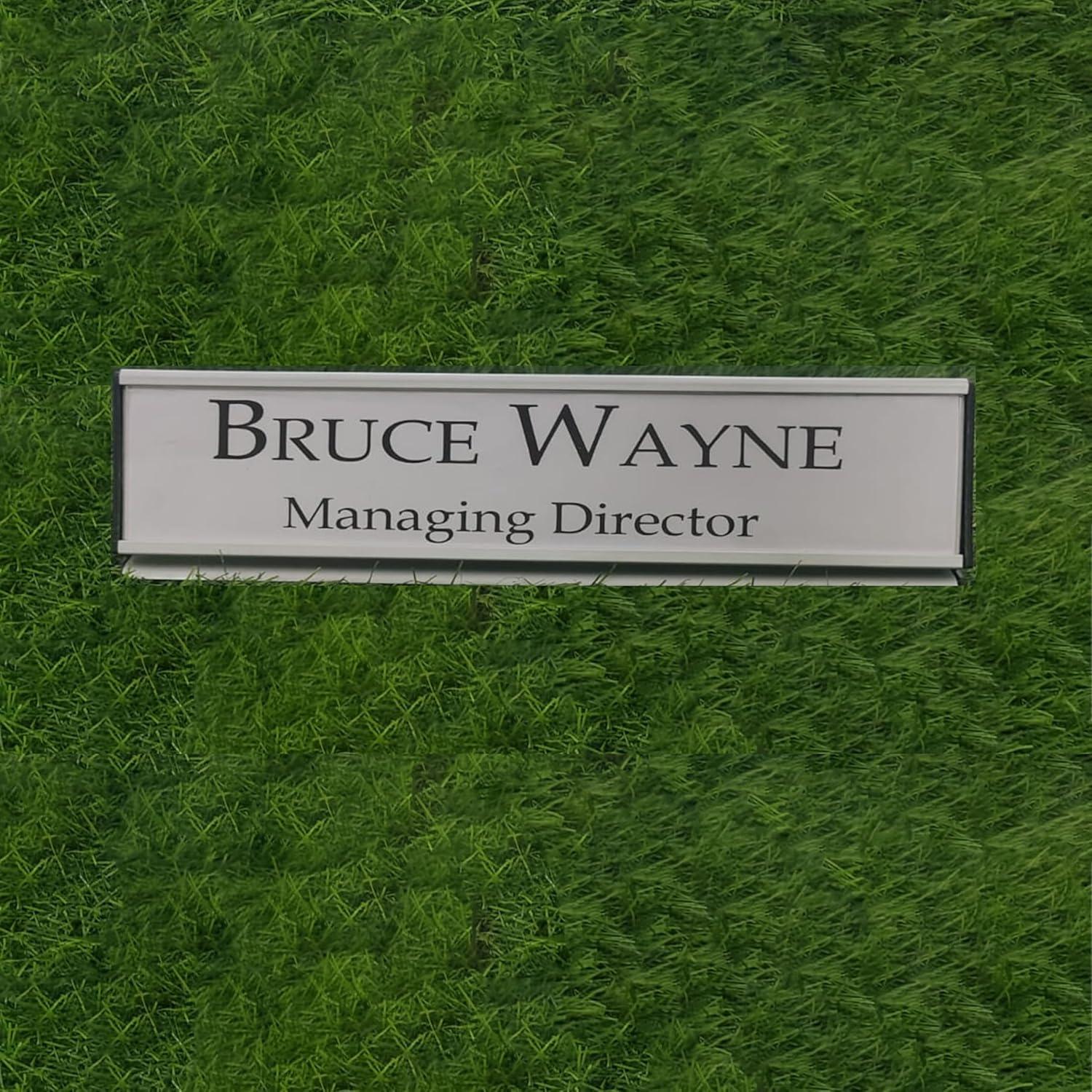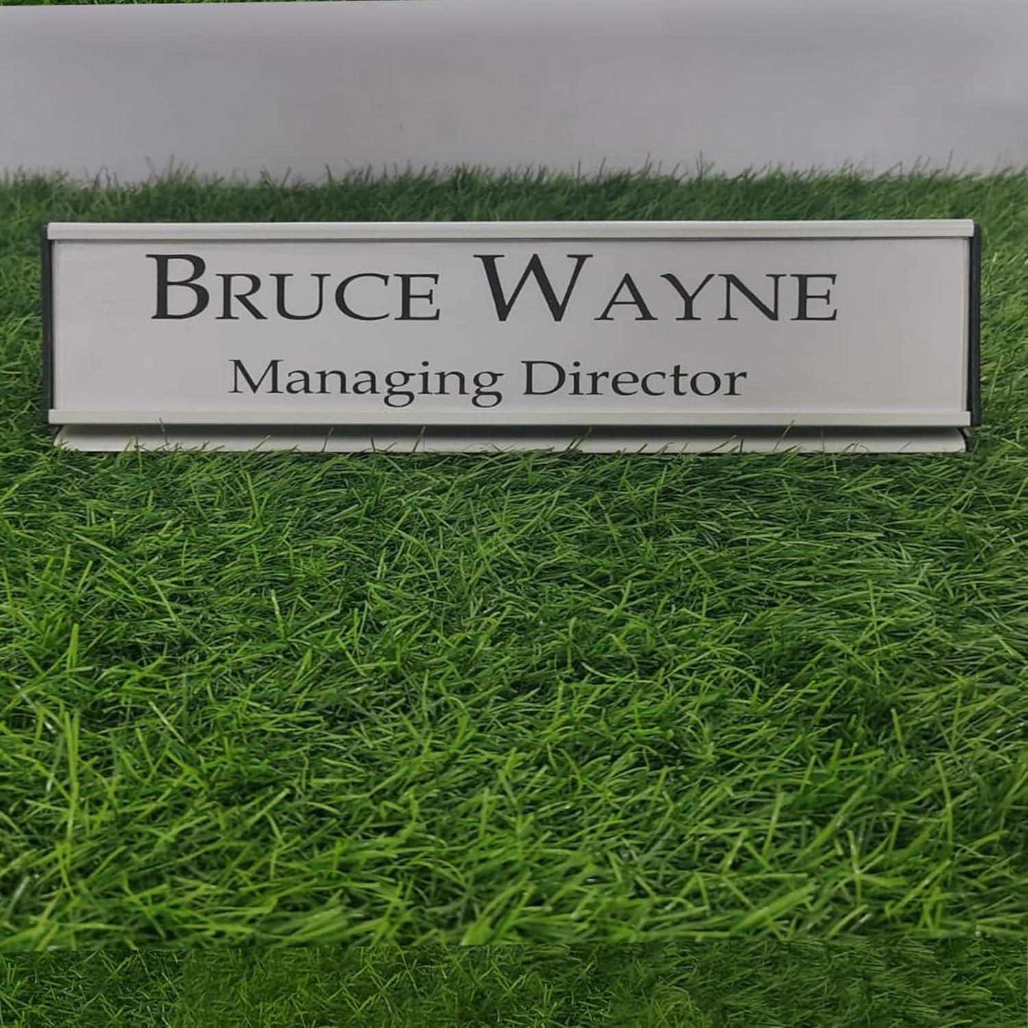 Gugan's Aluminum Desk Name Plate – Personalized Office Name Sign with Holder, Modern Desk Décor for Professionals, Boss, and Executives- Double Side (12 x 3 Inches) (Silver, Silver)