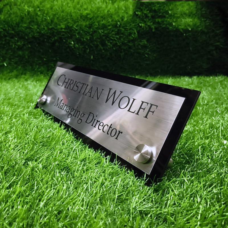 Gugan's Acrylic Desk Name Plate - Personalised Desk Name Plate, Custom Desk Sign, Office Plaque, Executive Office Sign (12 x 4 Inches) with 2 nos Studd (Black and Silver)