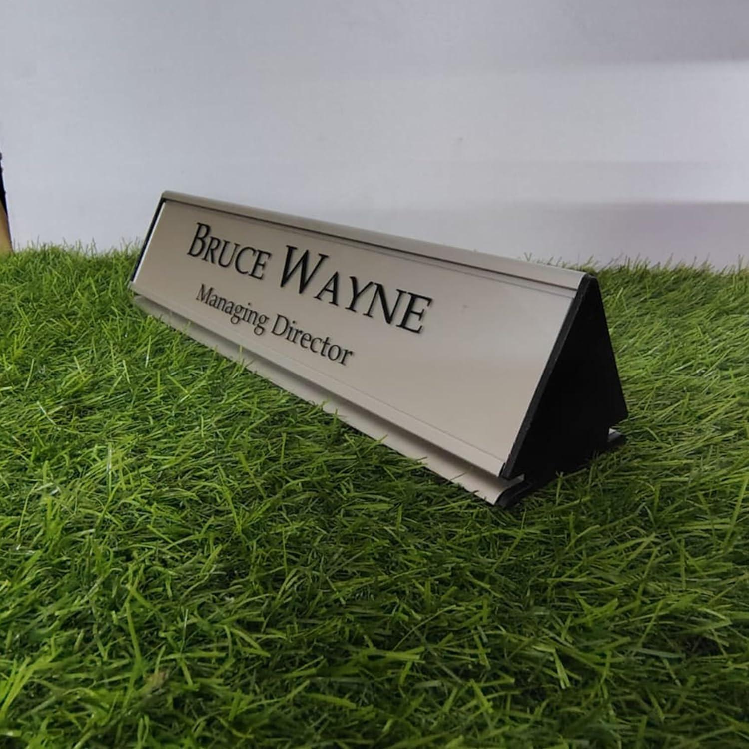 Gugan's Aluminum Desk Name Plate – Personalized Office Name Sign with Holder, Modern Desk Décor for Professionals, Boss, and Executives- Double Side (12 x 3 Inches) (Silver, Silver)
